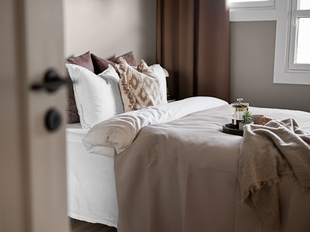 ベッドリネンもサラッとした夏仕様から、厚地のものへとシフトするのがおすすめ。